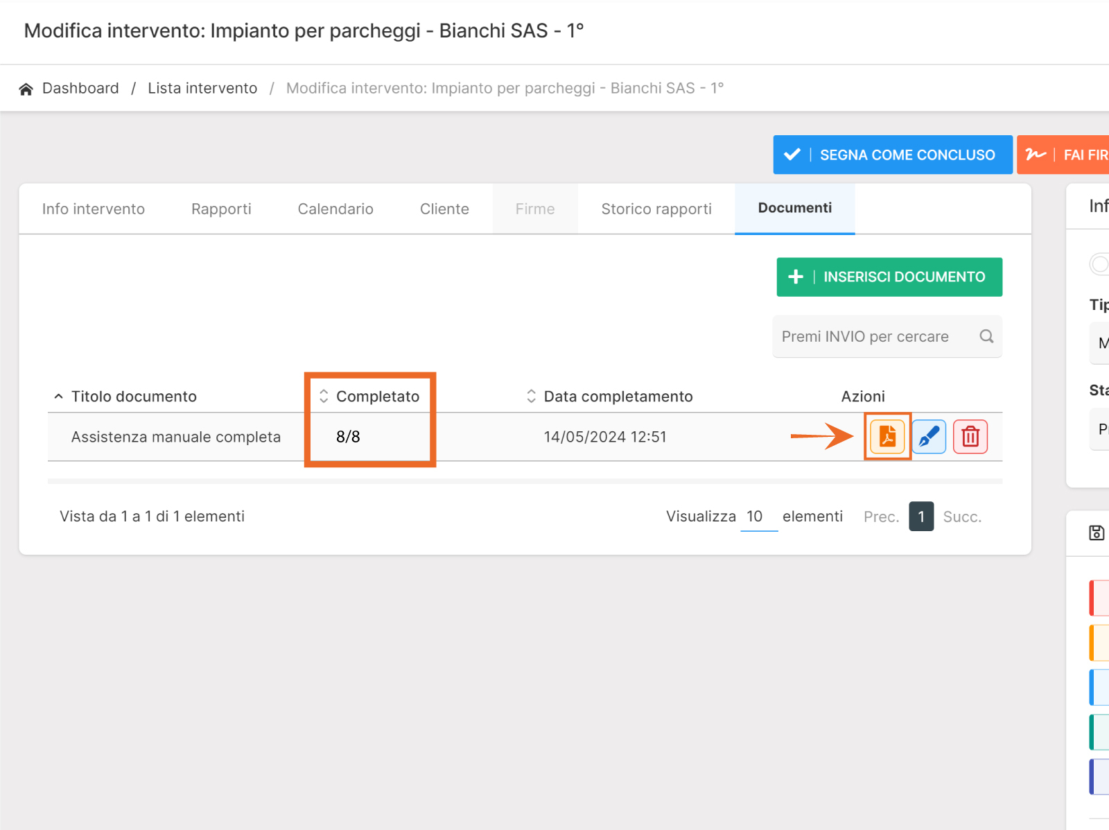 Dopo l'associazione, il dipendente o l'utente incaricato che effettua la manutenzione può procedere con la compilazione del documento, cliccando sull'icona matita corrispondente al documento che si desidera modificare.