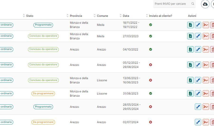 Di seguito una schermata illustrativa della visualizzazione di un elenco di tutti gli interventi, colonna “Inviato al cliente?”.