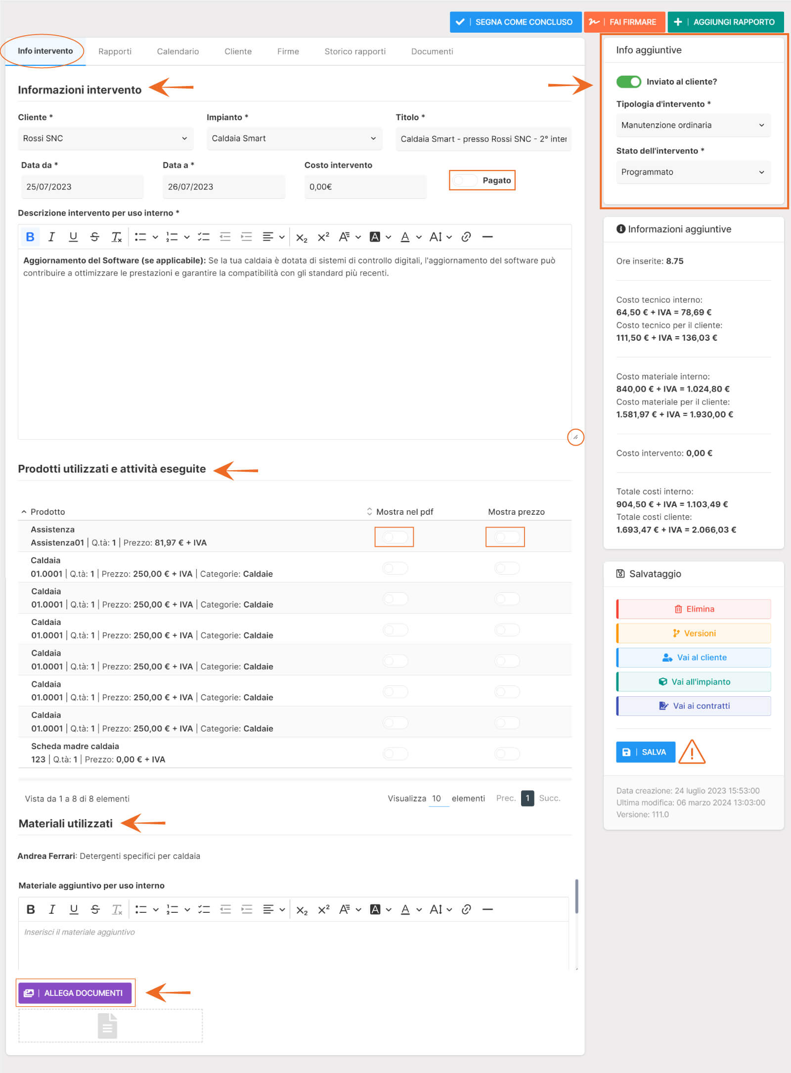 - Materiale aggiuntivo per uso interno, tale campo sarà visualizzato agli amministratori e dipendenti e potrà essere utilizzato per indicare materiale aggiuntivo non previsto da contratto/preventivo ma utilizzato durante l'intervento.