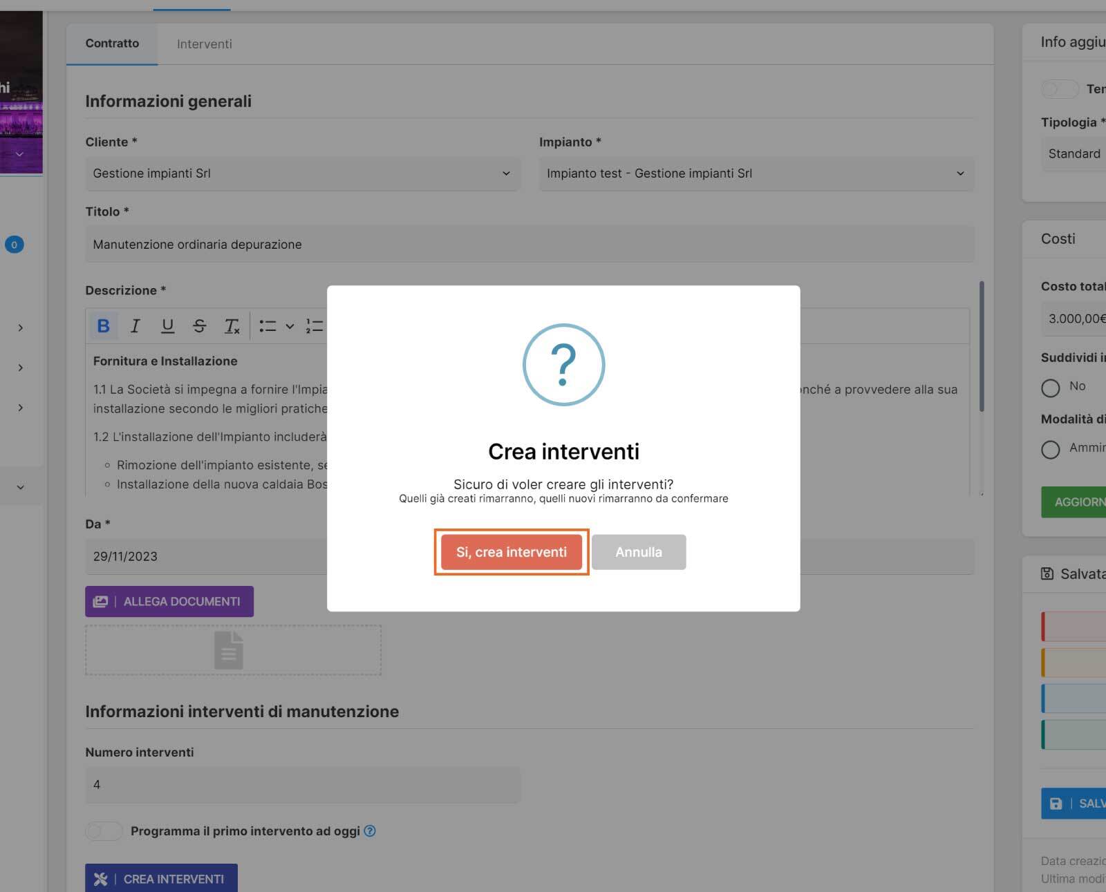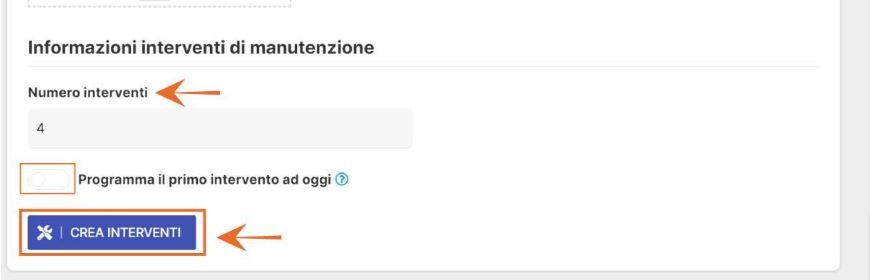 Esempio, contratto attivo per la durata di 1 anno con 4 interventi da programmare nel corso dell’anno. In questo caso si dovrà indicare nel campo il numero 4 e poi clicca sul bottone “CREA INTERVENTI”.