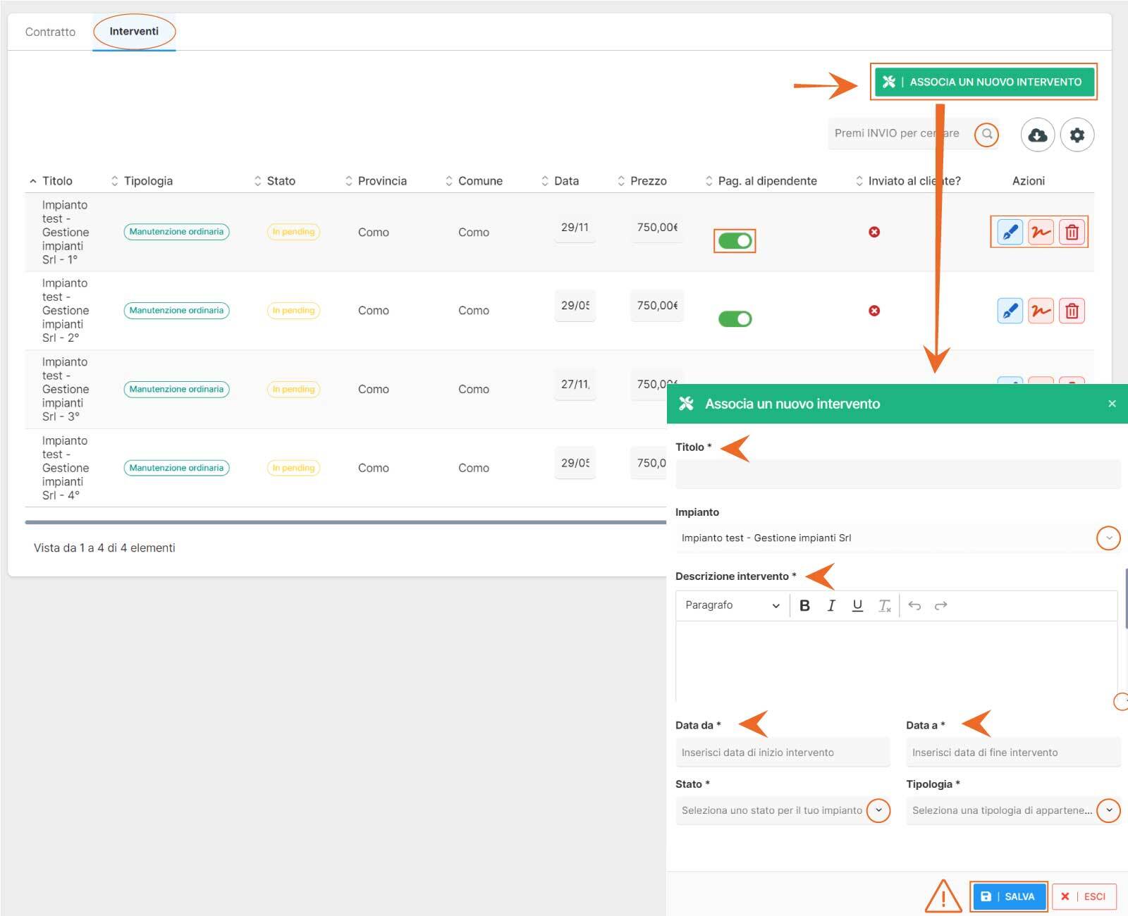 Inoltre, tramite la colonna “azioni” è possibile modificare/eliminare gli interventi creati in automatico e tramite il bottone “ASSOCIA UN NUOVO INTERVENTO” è possibile creare subito un nuovo Intervento associato al contratto.