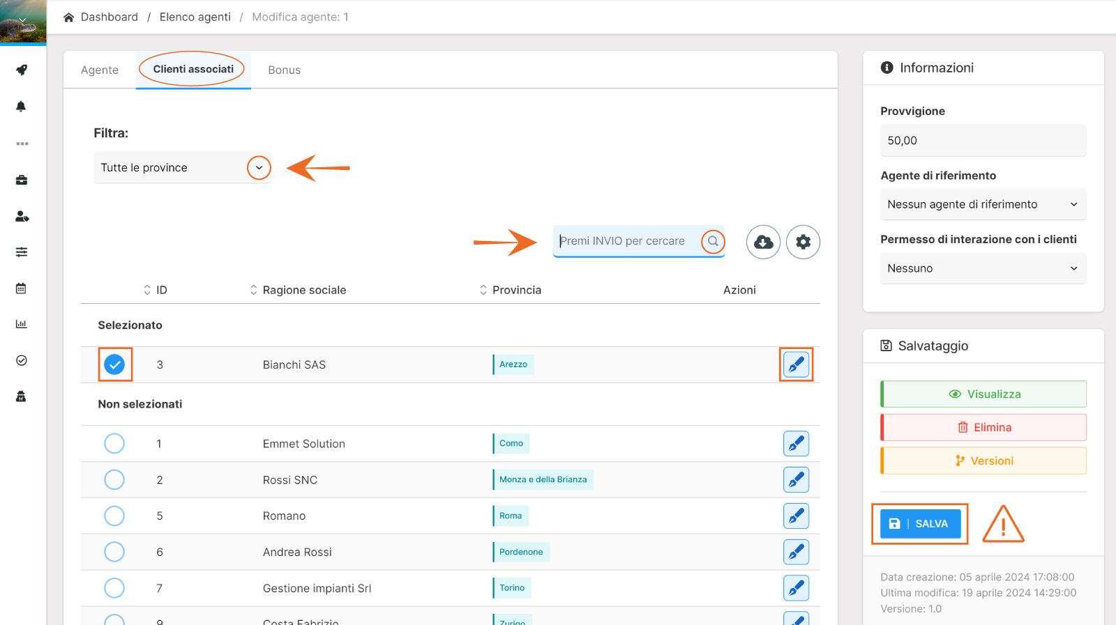 Una volta individuato il cliente da associare, spunta l'icona presente all'inizio della riga corrispondente al cliente. Questa azione assegnerà il cliente selezionato all'agente in questione.