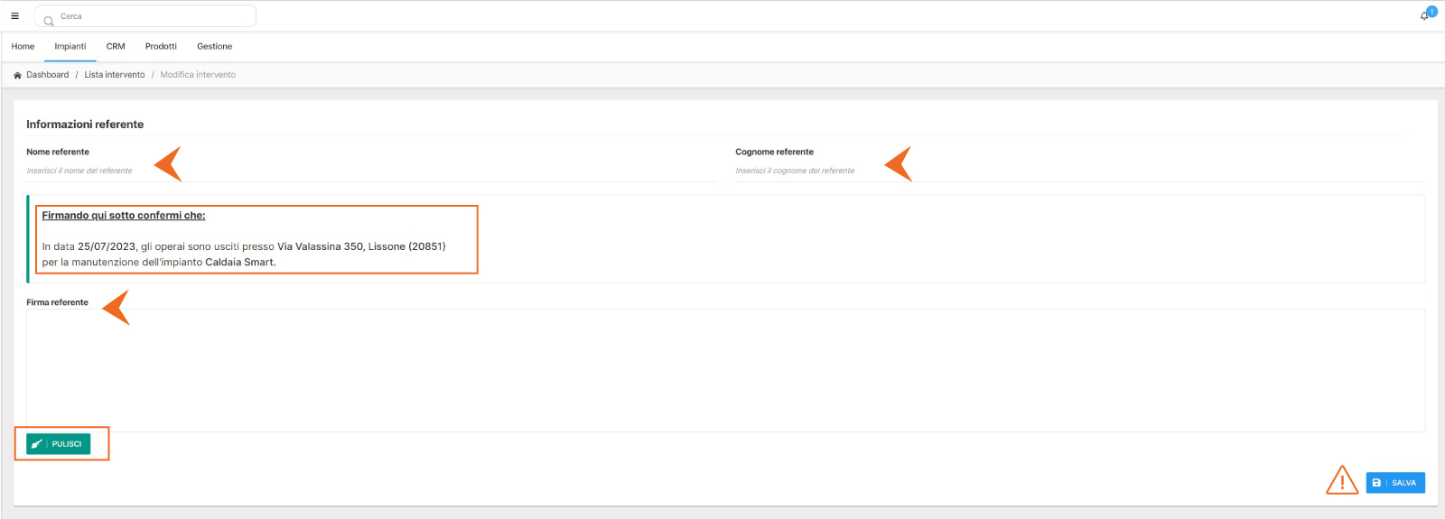 Si aprirà una nuova pagina, il tecnico dovrà inserire il nome e cognome del cliente/referente e verrà mostrata in automatico una dicitura che indicherà il giorno, il luogo e il nome dell’impianto in cui è stato svolto l’intervento. A questo punto il cliente/referente in loco dovrà apporre firma elettronica, in caso di errore è possibile ripulire il campo cliccando sul bottone “PULISCI”