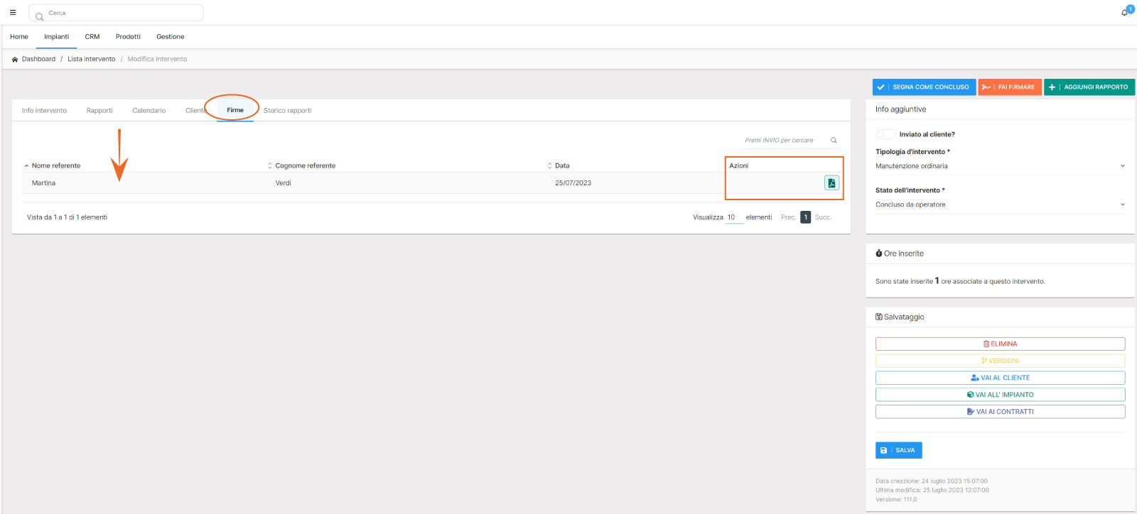 A questo punto il rapportino è stato caricato all’interno dell’intervento, sarà visibile e consultabile nel 5° tab “Firme”.