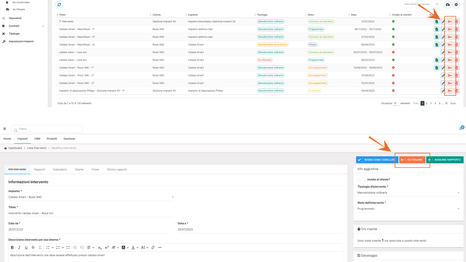 Nella lista degli interventi, sotto la colonna “Azioni” è presente il tasto “Fai firmare al cliente” altrimenti all’interno della scheda dell’intervento è presente in alto a destra il bottone rosso “FAI FIRMARE”.