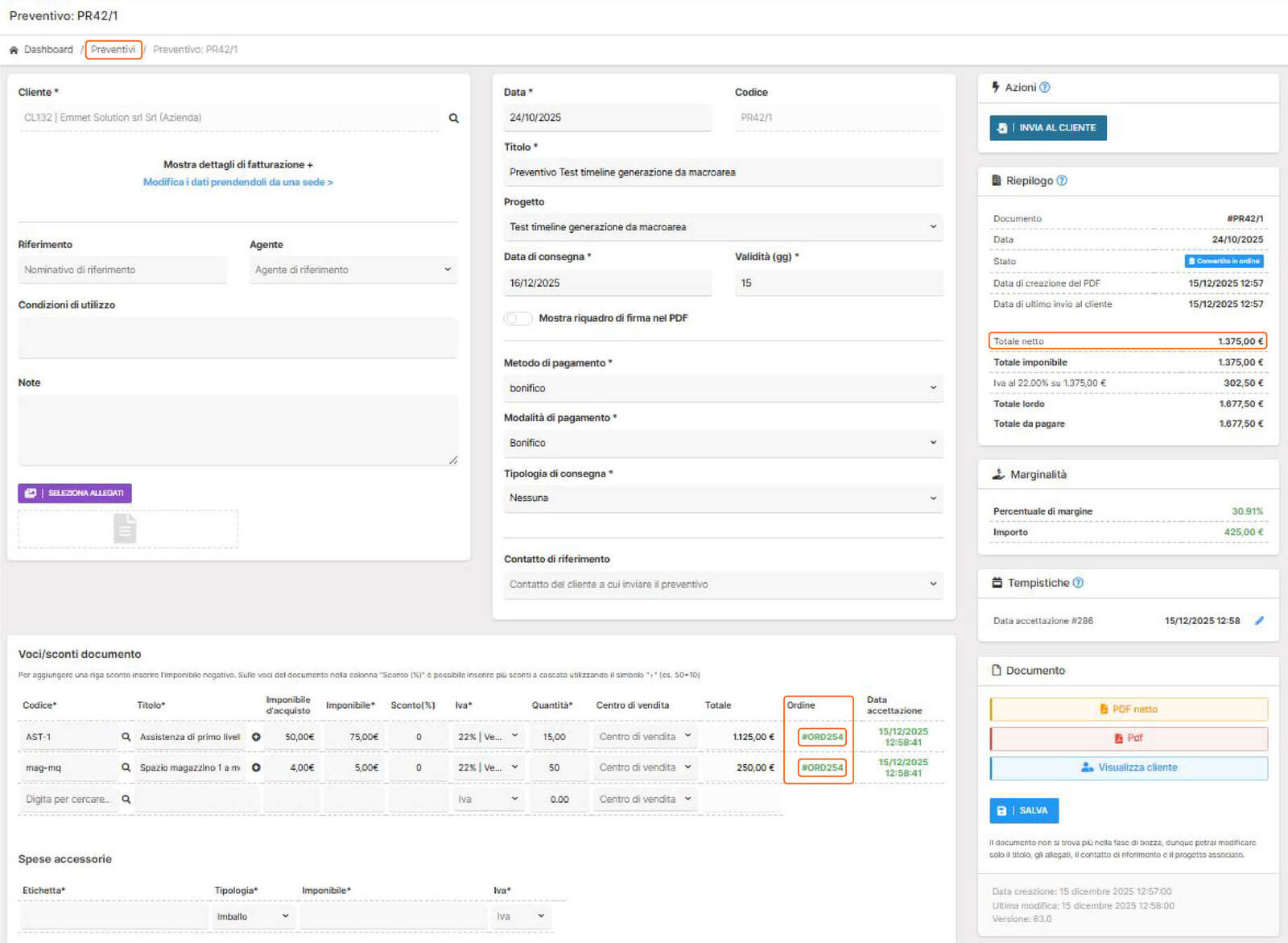 Il sistema ti indirizza alla pagina del preventivo e visualizzare il relativo ordine di riferimento, se presente.