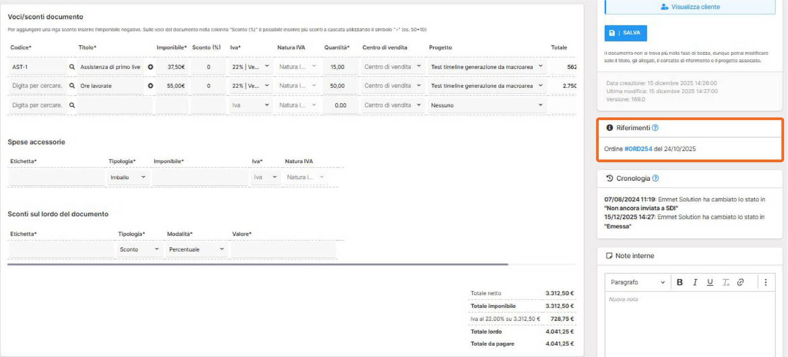 Il sistema indirizza automaticamente alla pagina della fattura. Nel box a destra “Riferimenti” sono visualizzati i collegamenti agli ordini.