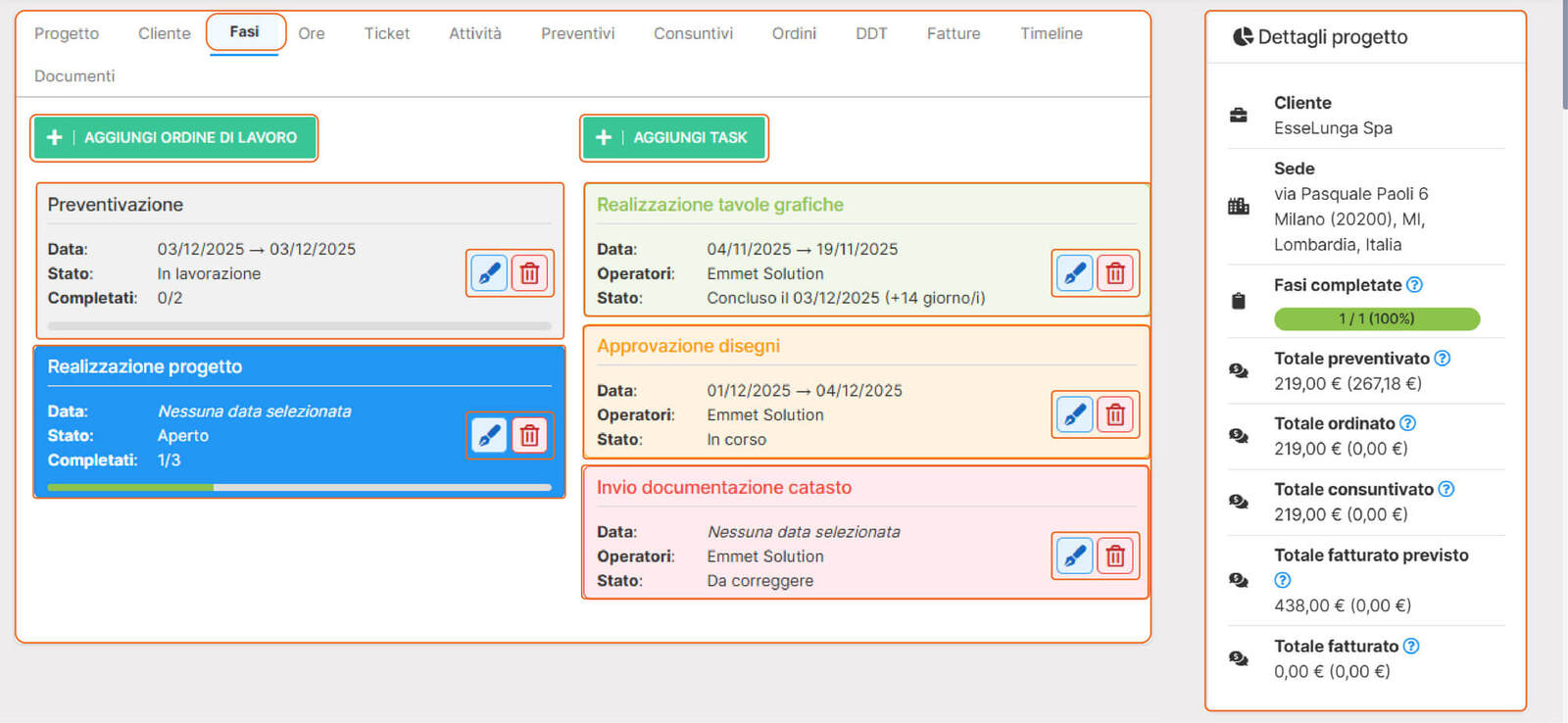 Completando i vari task e ordini di lavoro, avanza in modo automatico anche lo stato complessivo del progetto. La progressione viene riepilogata nella colonna di destra, nella sezione “Fasi completate”, che mostra il livello di avanzamento generale.