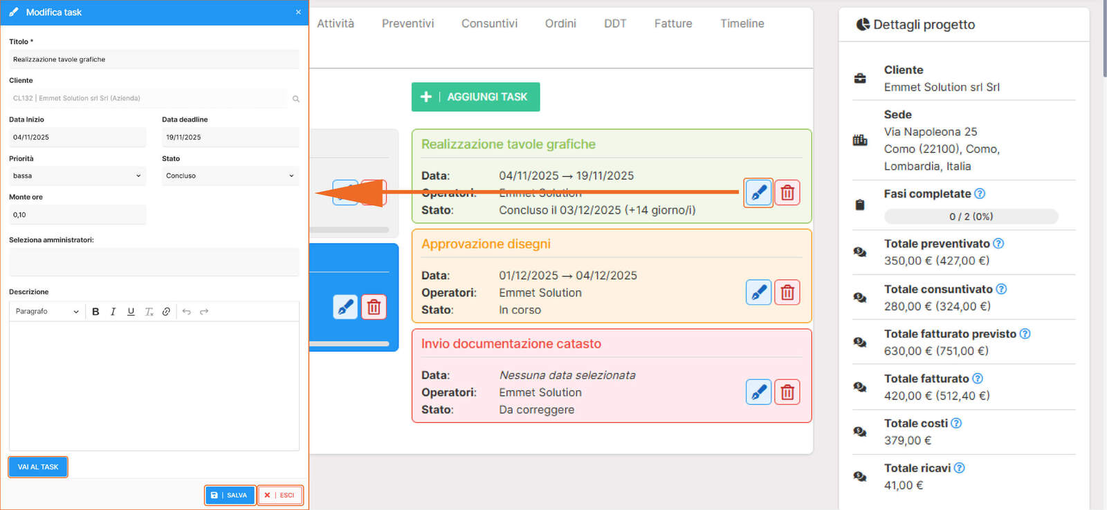 Il dettaglio è consultabile nel tab “Ordini” del progetto. Tramite l’icona a forma di matita è possibile accedere direttamente all'ordine.