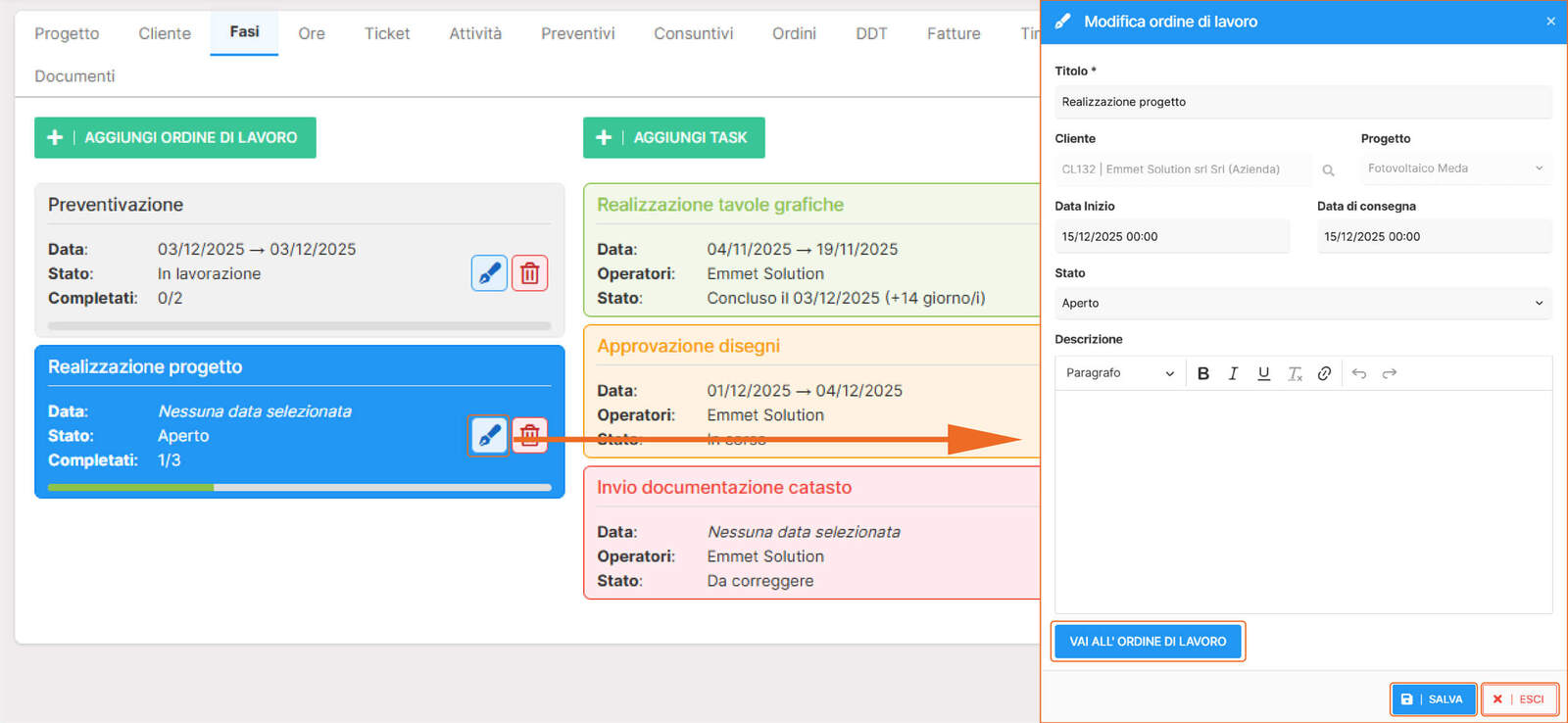 🟢 NOTA: Completando i task associati a un ordine di lavoro, lo stato dell’ordine di lavoro viene aggiornato automaticamente a completato. Quando tutti gli ordini di lavoro del progetto risultano completati, viene raggiunto il completamento delle fasi, indicando la conclusione operativa del progetto. Questo meccanismo consente di monitorare in modo automatico e coerente l’avanzamento delle attività, dalla singola operazione fino alla chiusura dell’intero flusso di lavoro.