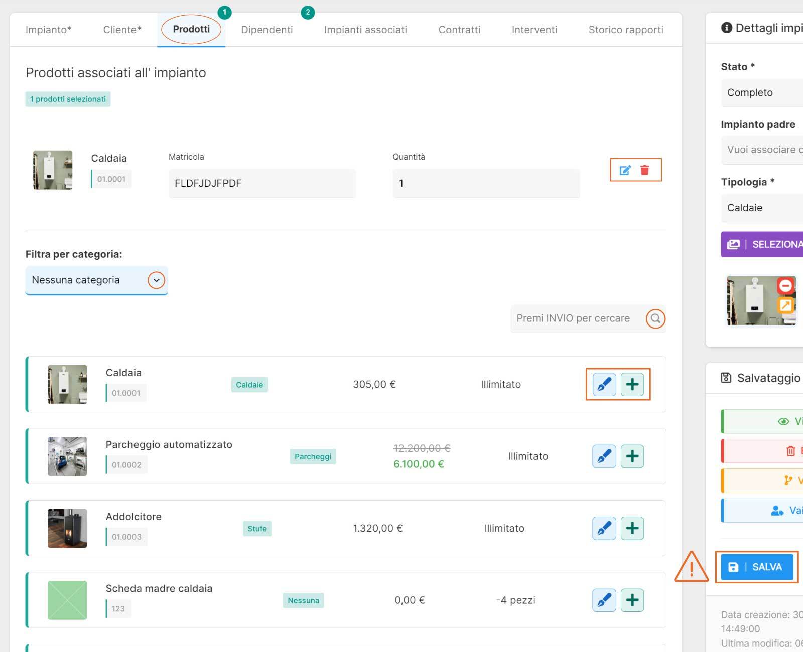 Nel tab “Prodotti”, potrai associare i prodotti all’impianto tramite il tasto Associa "+" presente su ogni riga del prodotto. Una volta associato è necessario inserire la quantità.