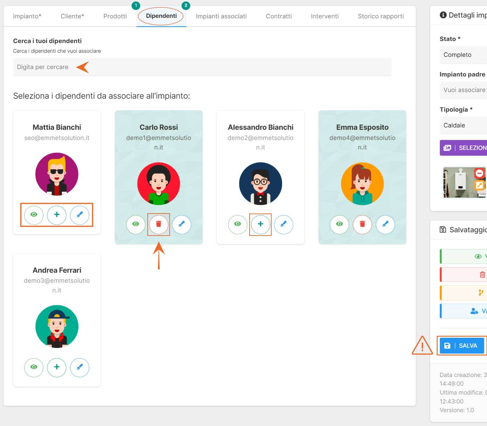 Nel tab “Dipendenti”, potrai associare i dipendenti che gestiranno l’impianto tramite il tasto Assegna "+" presente su ogni riga. È anche possibile ricercare il dipendente che vuoi associare all’impianto, tramite l’apposita barra di ricerca.