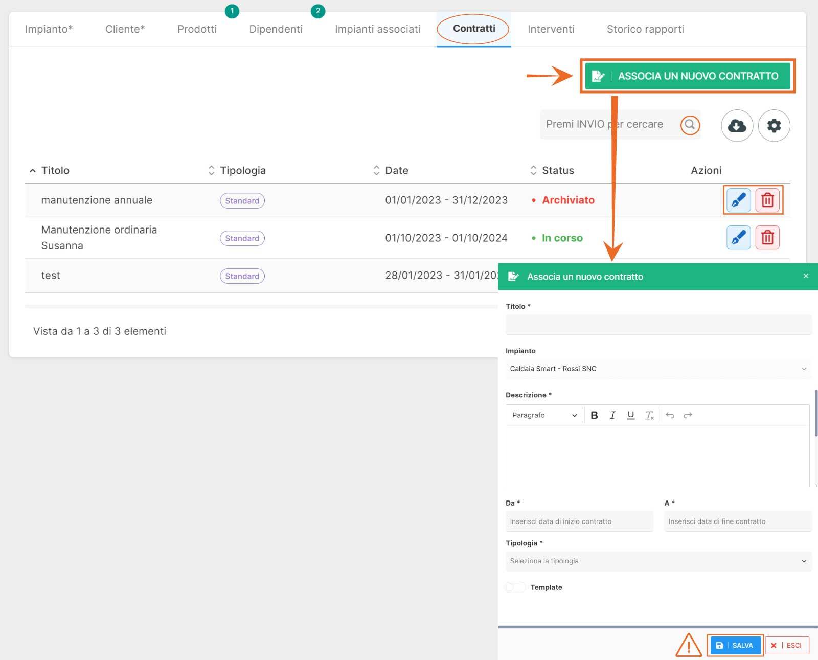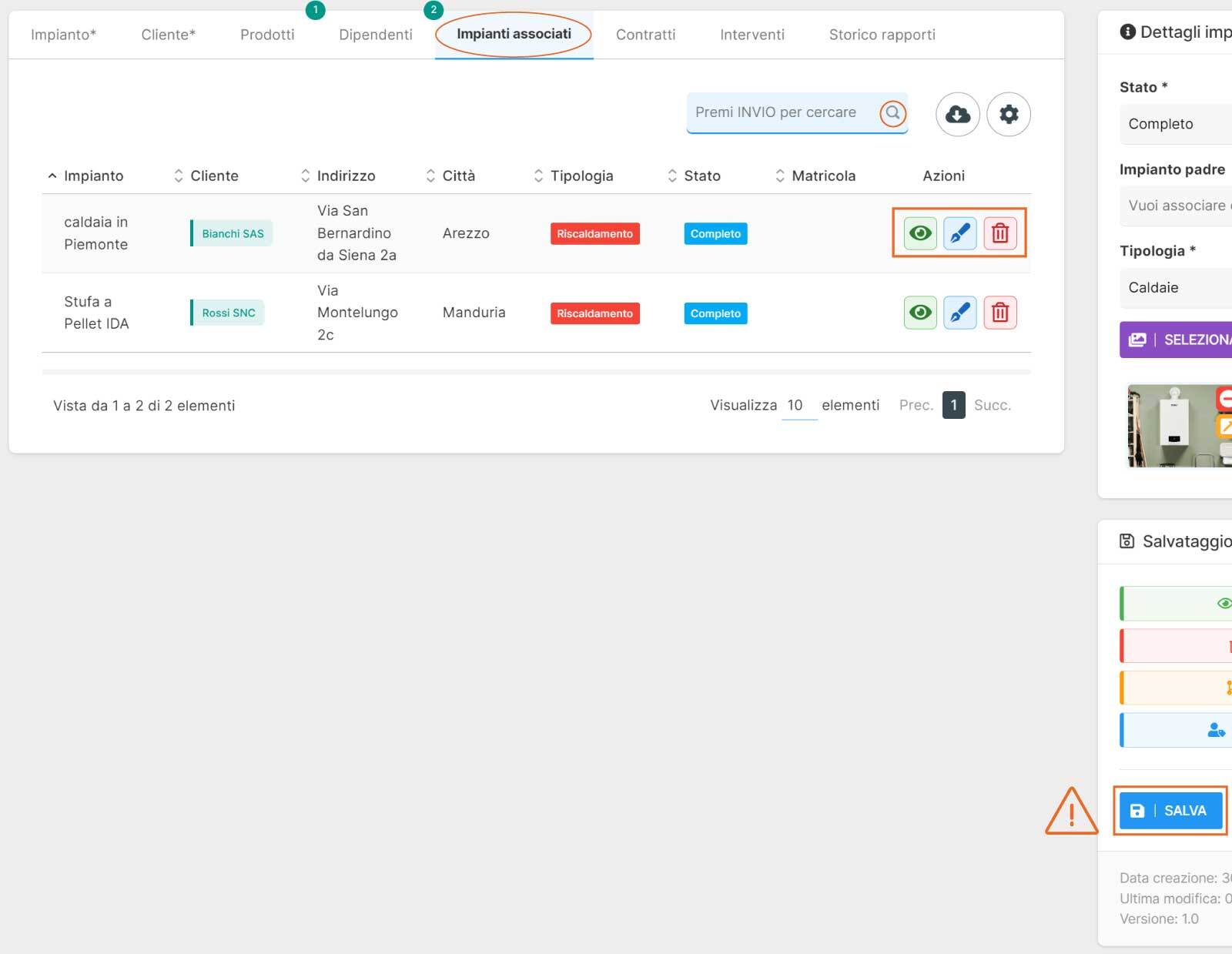 Inoltre, tramite la colonna “Azioni” puoi visualizzare o modificare un impianto associato, cliccando sull'apposito bottone corrispondente.