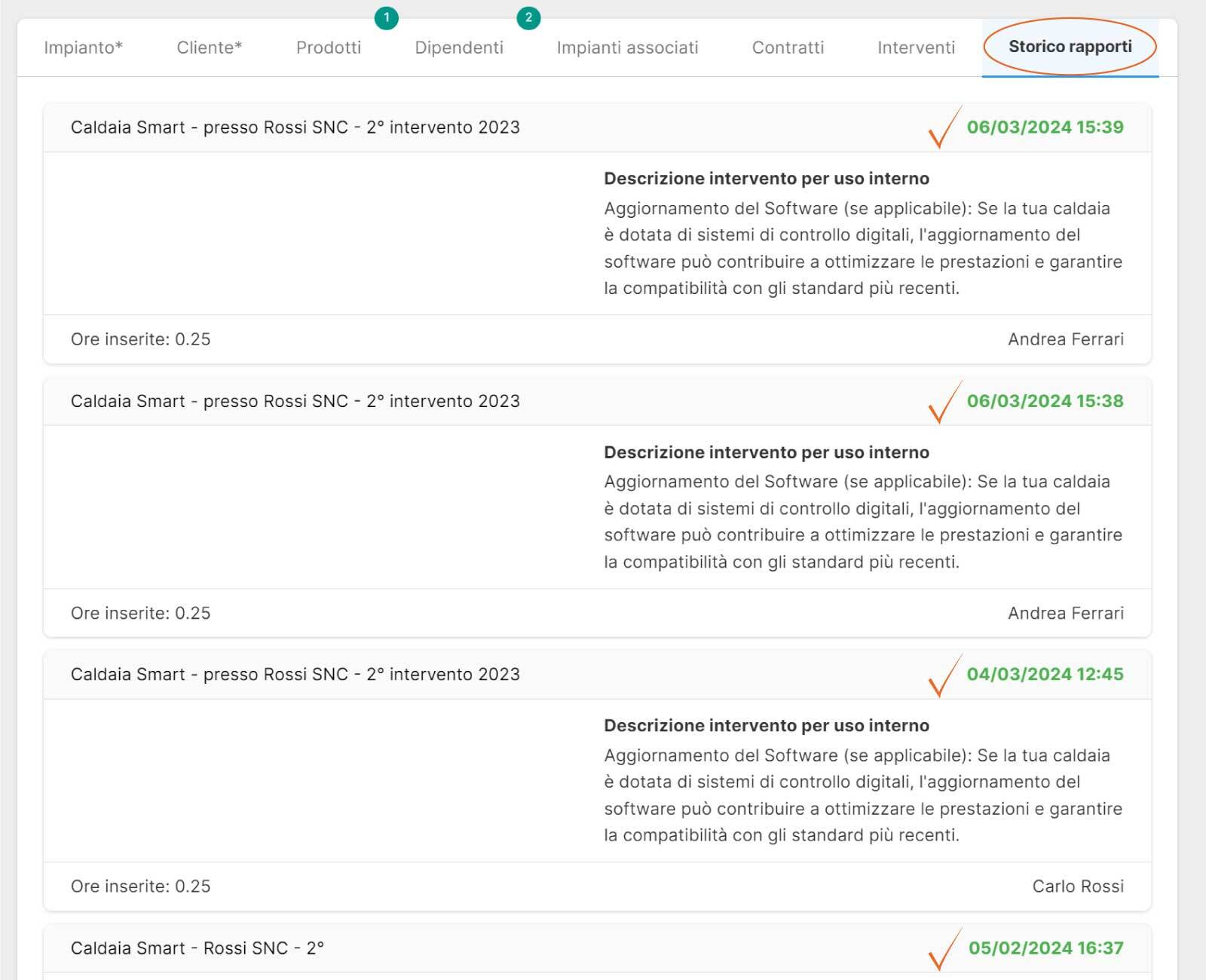 Nel tab "Storico rapporti”, avrai una visuale completa di tutti i rapportini di intervento caricati a seguito di una manutenzione svolta. In questo modo potrai consultare velocemente gli interventi effettuati su un determinato impianto.