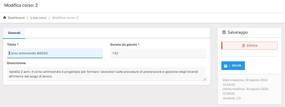 - Durata in giorni: specifica la durata in giorni, intendendo la validità del corso.