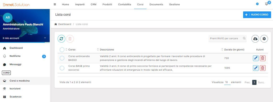 Dal menù principale, seleziona la voce "CORSI". In questa sezione avrai la panoramica completa di tutti i corsi presenti nel gestionale.
