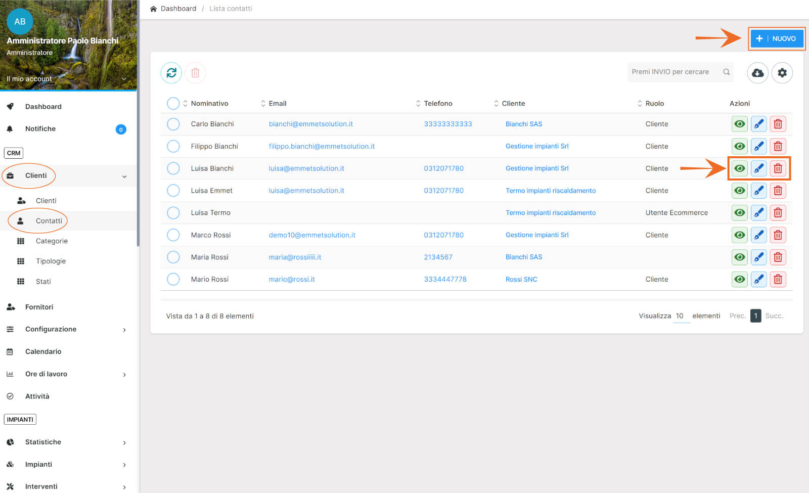 Per creare un nuovo contatto, clicca sul bottone presente in alto a destra “+NUOVO”.