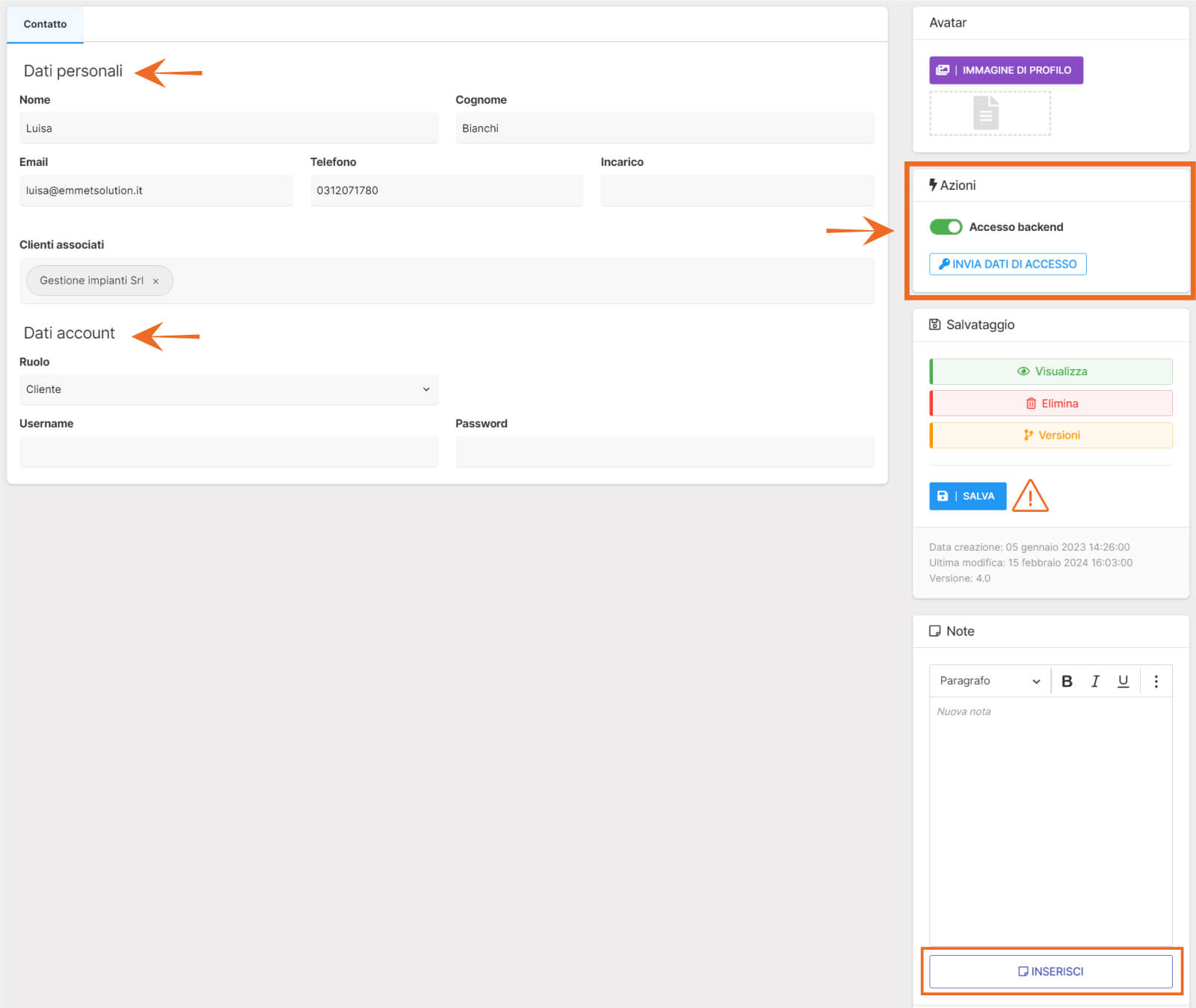 ATTENZIONE: se il contatto viene abilitato all'accesso del gestionale, è necessario inserire l'username nei dati account, PRIMA dell'invio della email. Invece, la password sarà generata in automatico dal sistema, dopo il primo accesso, l'utente potrà modificarla tramite il proprio pannello di gestione.