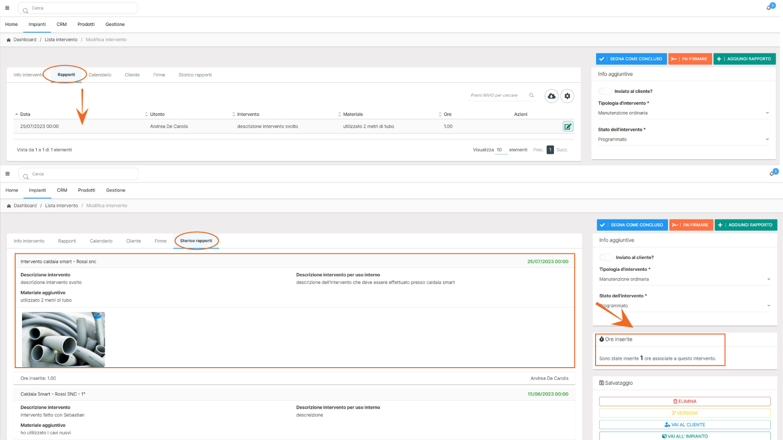 A questo punto il rapportino è stato caricato all’interno dell’intervento, sarà visibile nel tab “Rapporti” e nel tab “Storico rapporti”.