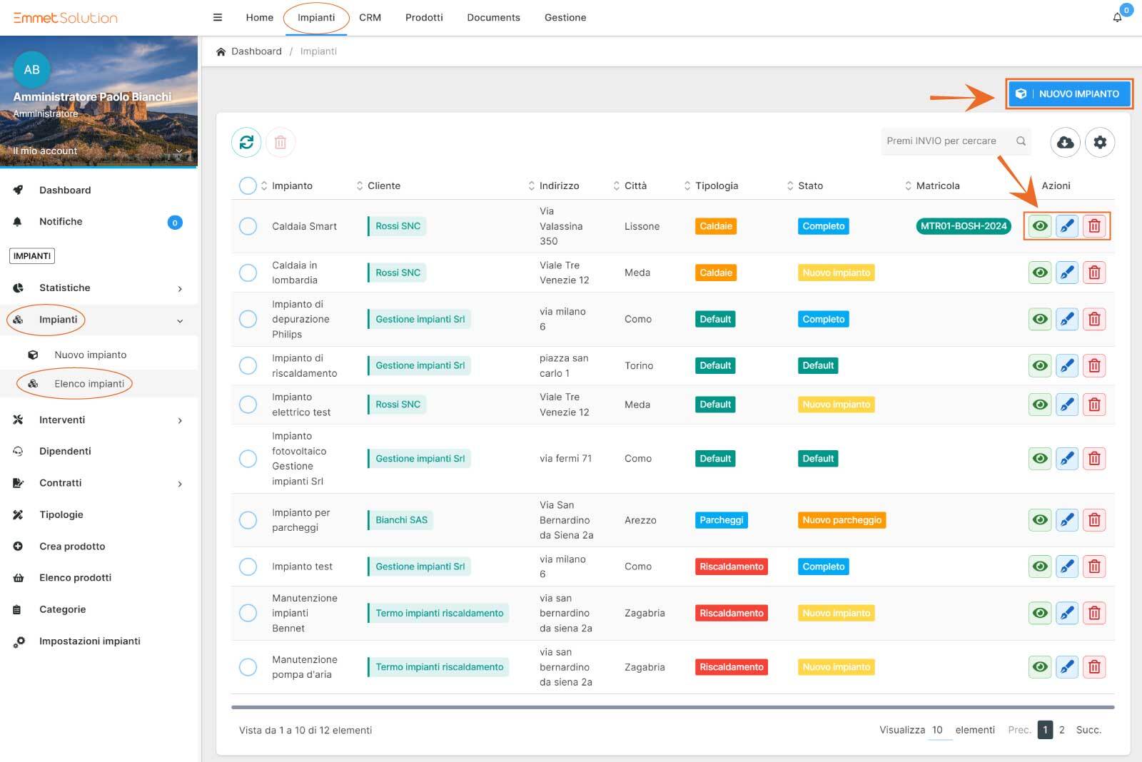 Inoltre, tramite la colonna “Azioni” è possibile visualizzare/modificare/eliminare gli impianti creati e tramite il bottone “NUOVO IMPIANTO”, presente in alto a destra, è possibile creare un nuovo impianto. Per maggiori informazioni sull’inserimento di un nuovo impianto, clicca qui.