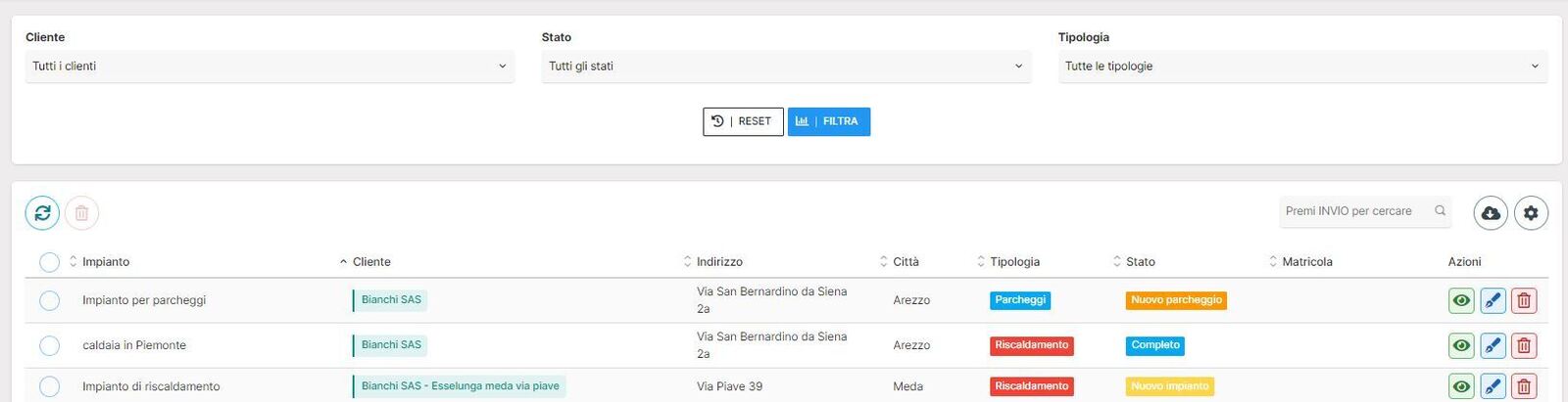 In questa pagina si avrà la panoramica completa di tutti gli impianti caricati sul gestionale. In testata è presente una barra di ricerca con menu a tendina (per cliente, stato o tipologia) per facilitare la consultazione degli impianti presenti nel CRM.