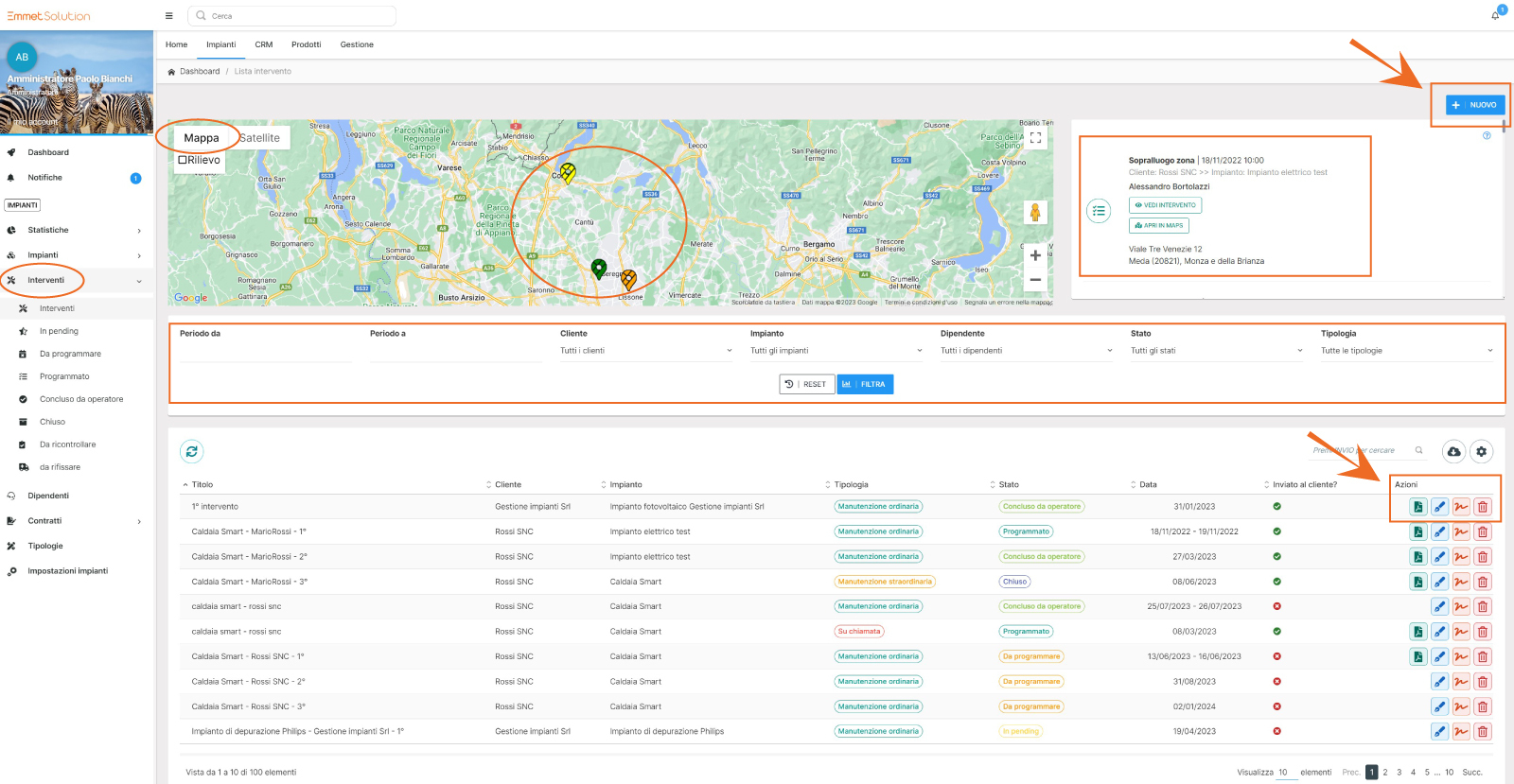 La mappa mostra tutti gli interventi, a destra avrai un primo dettaglio con un riepilogo e potrai effettuare delle ricerche tramite i filtri presenti sotto alla mappa.