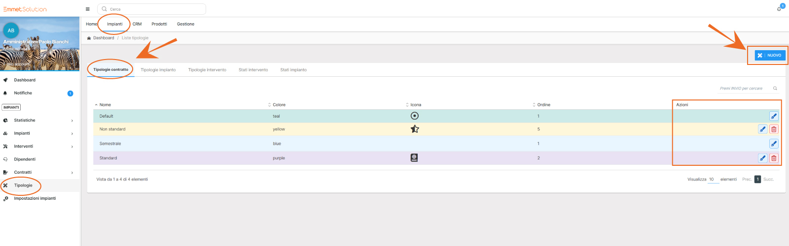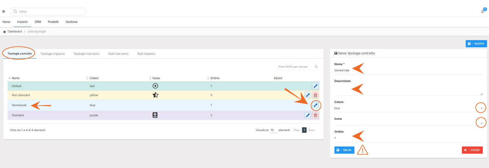 In questa sezione potrai inserire e gestire le tipologie di contratto, impianto, intervento e gli stati degli interventi e impianti.